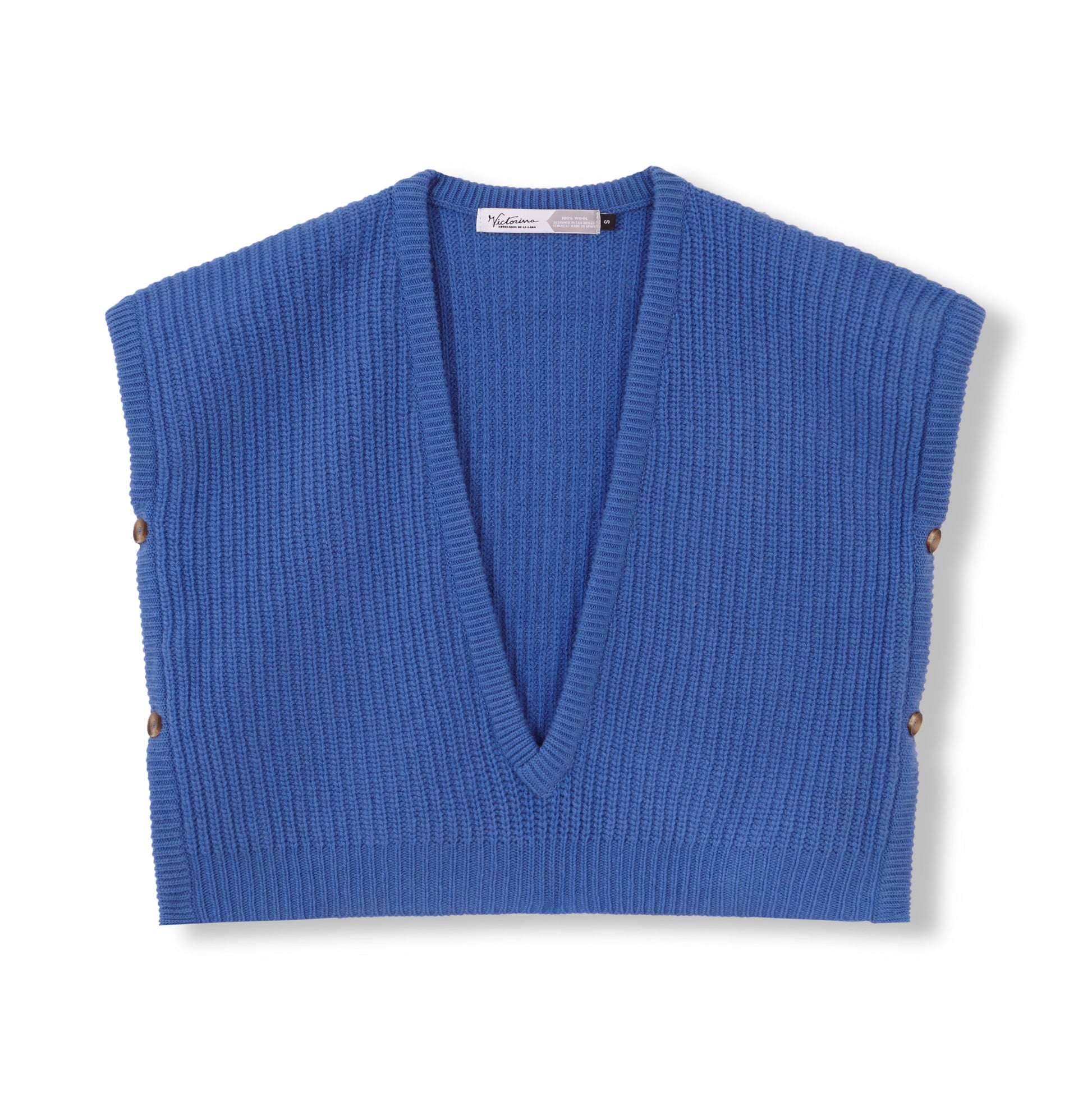 Chaleco de punto perlado confeccionado artesanalmente con 100% lana de origen europeo en un sofisticado tono azul. Una pieza versátil que aporta textura, color y calidez a cualquier conjunto.