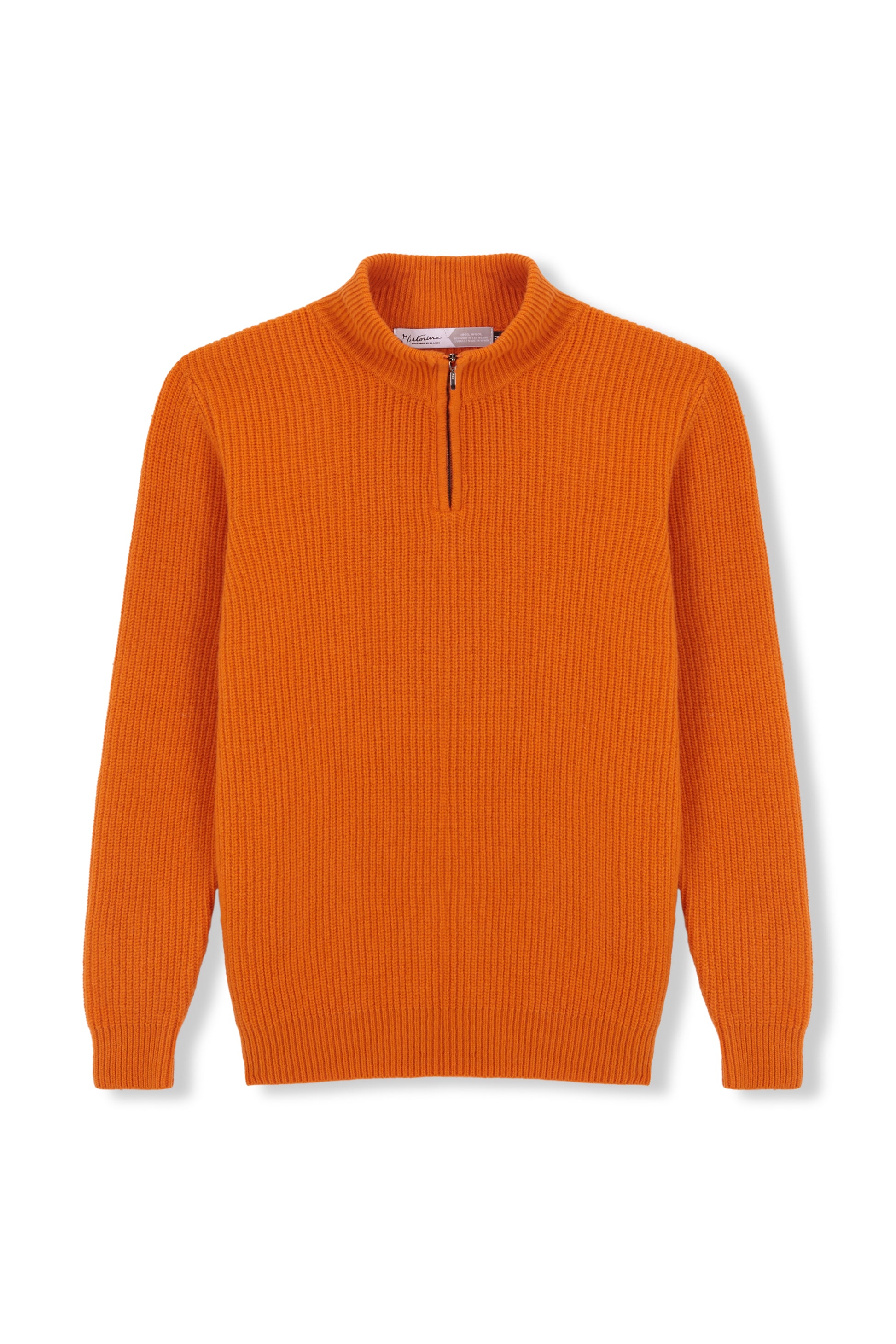 Jersey de punto perlado con cuello alto y media cremallera, confeccionado íntegramente con lana merino de origen italiano. Un diseño versátil que combina calidez, textura y funcionalidad en un vibrante tono naranja.